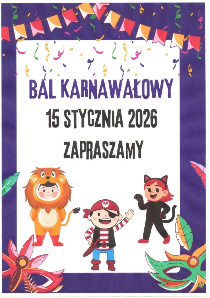 W czwartek, 15 stycznia 2026 r. w ramach zajęć dydaktycznych odbędzie bal karnawałowy. Zabawa z Wodzirejem rozpocznie się zaraz po śniadaniu i trwać będzie do pory obiadowej. Prosimy rodziców o przygotowanie dzieciom wygodnych i bezpiecznych strojów karnawałowych