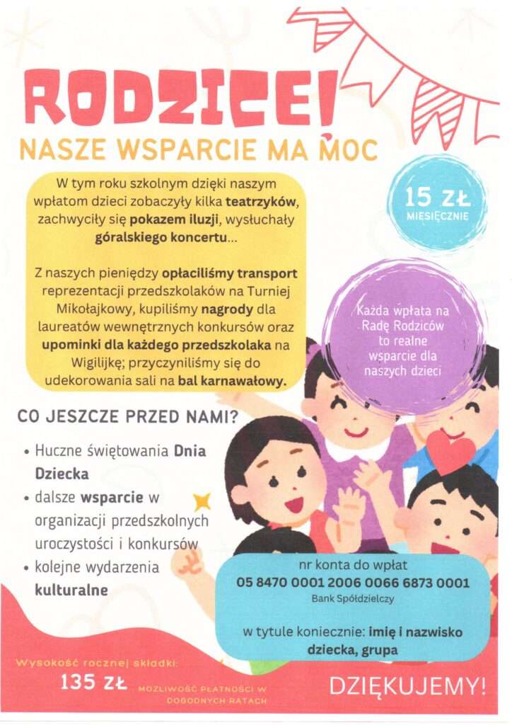 Przypominamy o składce na Radę Rodziców. Z tych funduszy w najbliższym czasie mają być opłacone m.in. UPOMINKI CHOINKOWE DLA DZIECI. Numer konta i wysokość składek znajduje się w zakładce RADA RODZICÓW.